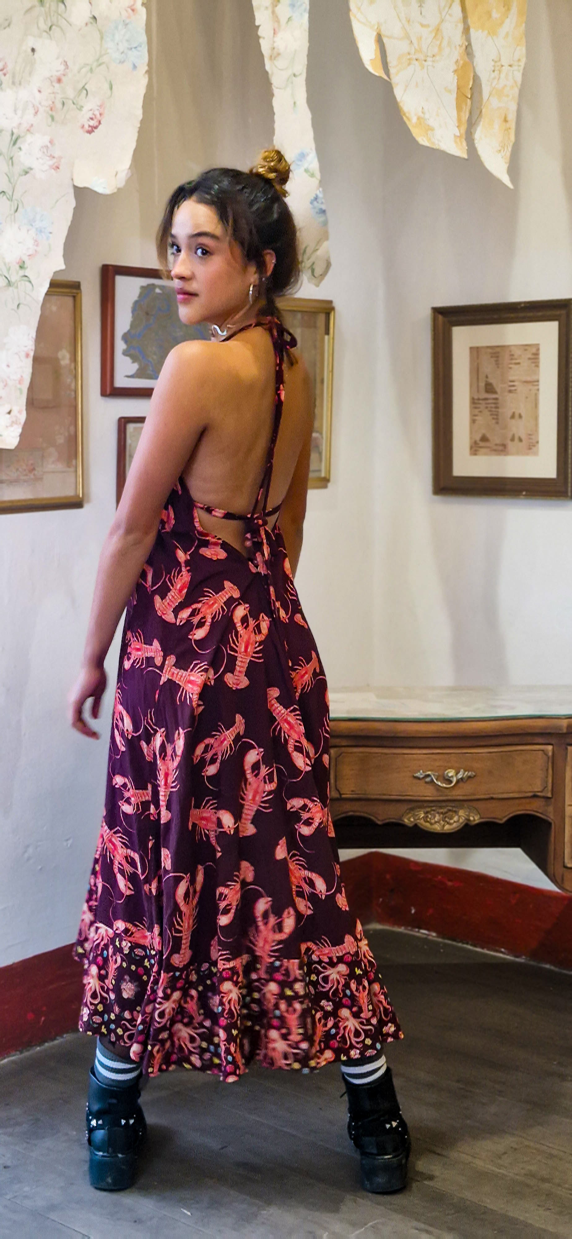 Puedes llevar el Vestido Baile de la Langosta con sandalias para un look fresco y relajado, o combinarlo con botas y una chaqueta ligera para un estilo más urbano y atrevido. Es perfecto tanto para el día como para la noche, cuando quieres una prenda que hable por sí sola.